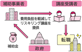 キャリア相談、リスキリング(講座受講)、転職支援は、本事業に採択された補助事業者のもとで受けることができます。補助事業者に補助金が支給されることで、受講者の費用負担が軽減されます。